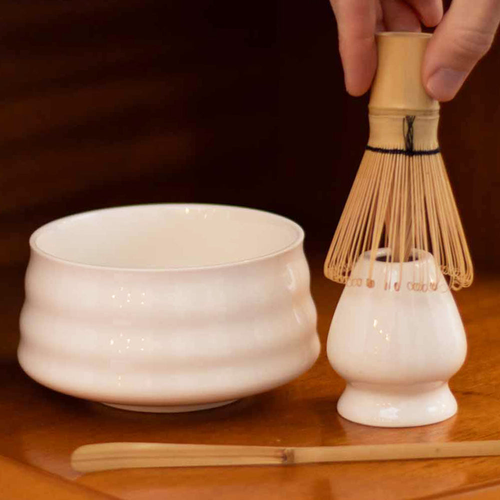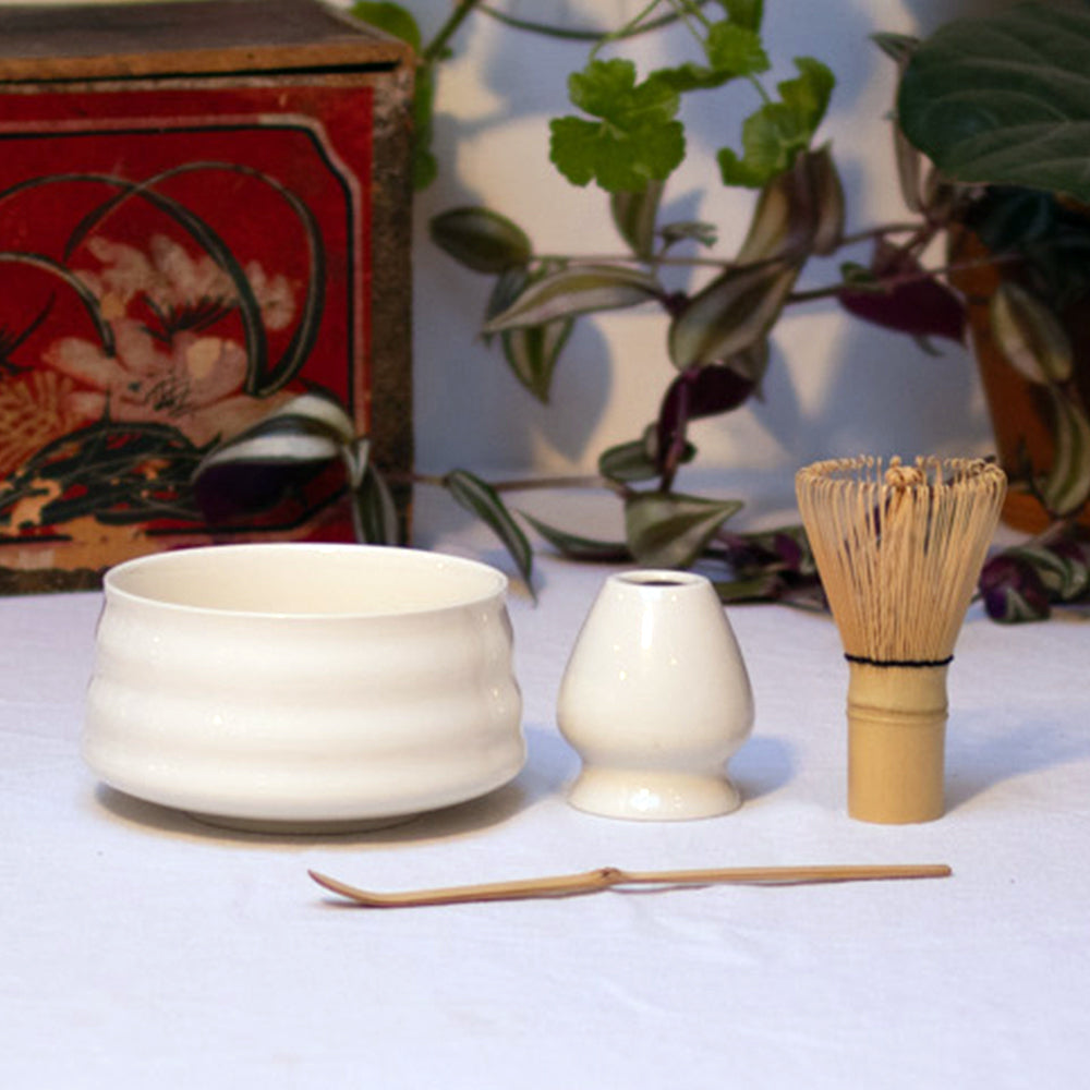 We have all the essential kit you need to make a perfect bowl of matcha -the scoop, whisk, and the bowl. The set also includes a matcha whisk stand to help maintain the shape of your tines.