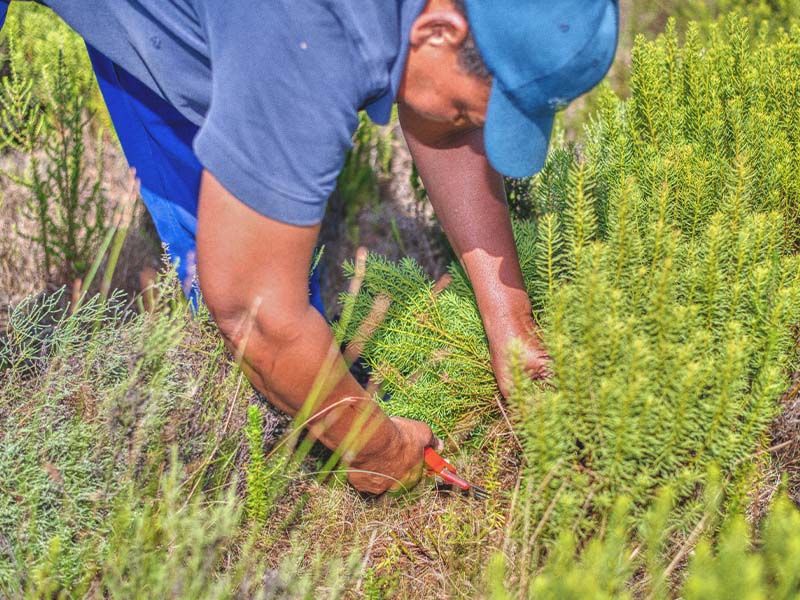 Although all the honey bush has been planted, it is not a monocrop - the natural fynbos plants are encouraged to flourish in harmony. This means that these harvesters need to identify the honeybush tea between dozens of other fynbos plants and that grow symbiotically.