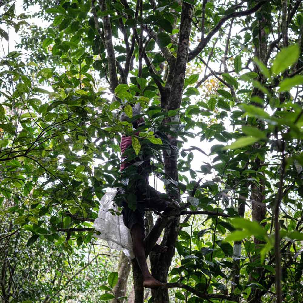 The tea and vanilla orchids flourish together in an agroforestry garden. Nestled under Adams Peak in the Erathna Valley, the garden is located on an abandoned tea farm that has been left to re-wild for over 130 years.